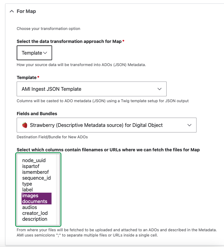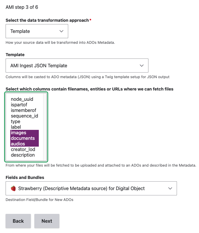 Strawberry (Descriptive Metadata source) for Digital Object - Then select which columns contain filenames, entities or URLS where files can be fetched from. Select what columns correspond to the Digital Object types found in your spreadsheet source.