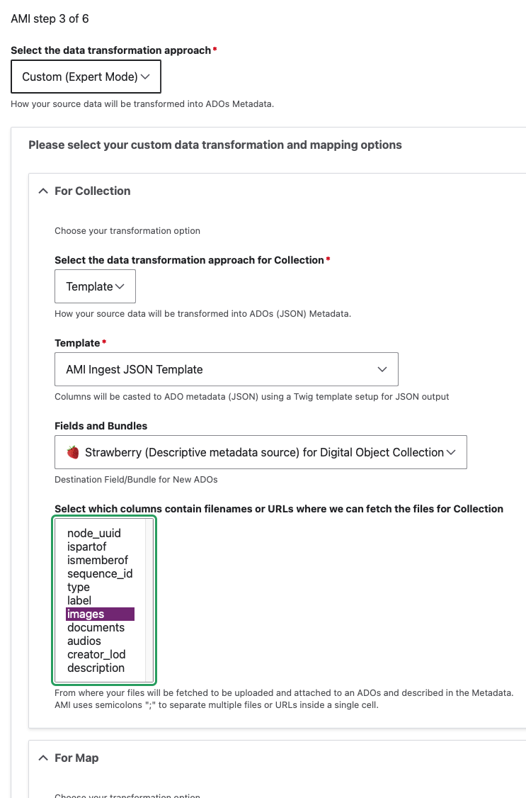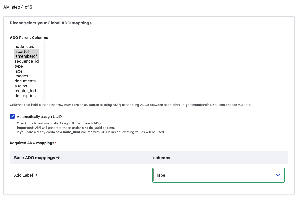 labelcolumn for ADO Label. This selection is only used as a fail-safe (in case your AMI JSON Ingest Template does not have any mapping for a column to be mapped to the JSONlabelkey, or your source data csv does not contain alabelif going Direct for data transformation). - In order to make sure that Digital Objects containing the corresponding UUID or spreadsheet row number for any corresponding Collections, make sure
