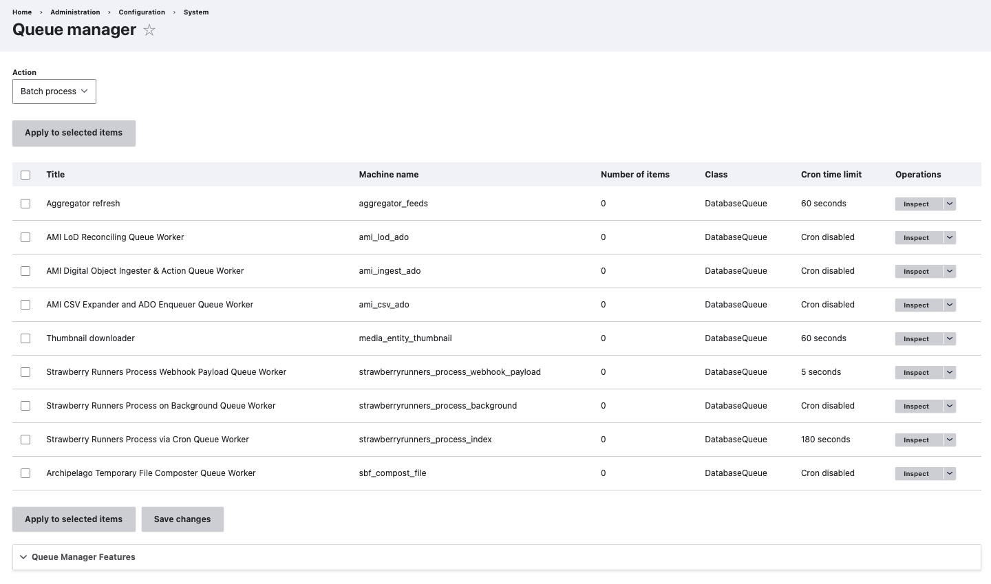 If you chose to place your AMI set in the Queue to Process in step 7 and you wish to manually kickstart the Queue Processes, navigate to the Queue Manager found at /admin/config/system/queue-ui. (Be sure to select the Queue Manager under the System section, not the Queue Manager for Hydroponic Service under the Archipelago section).