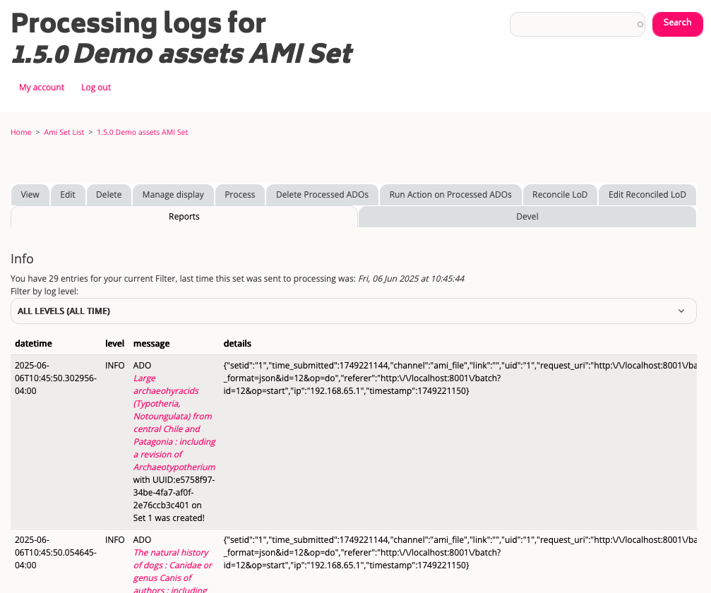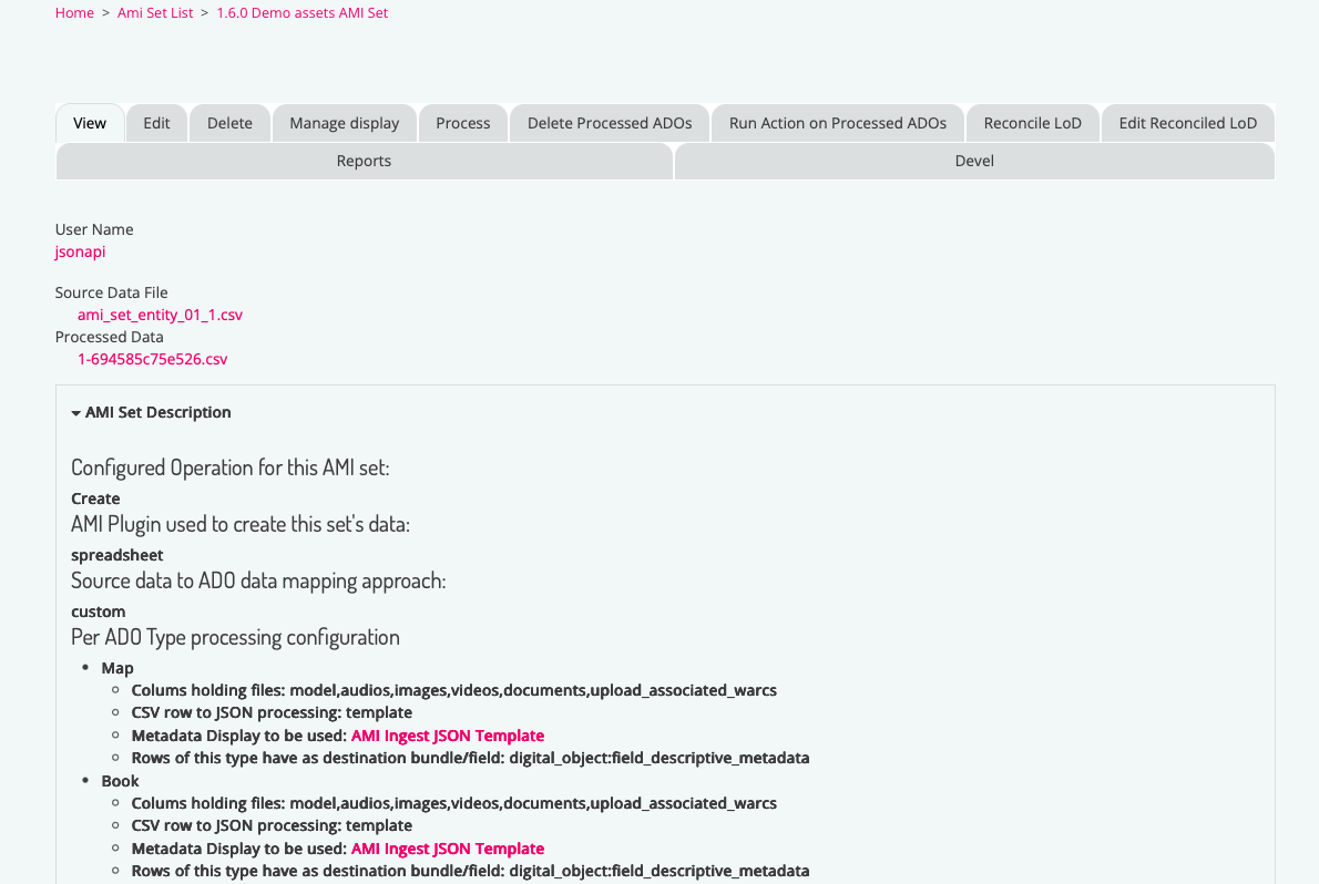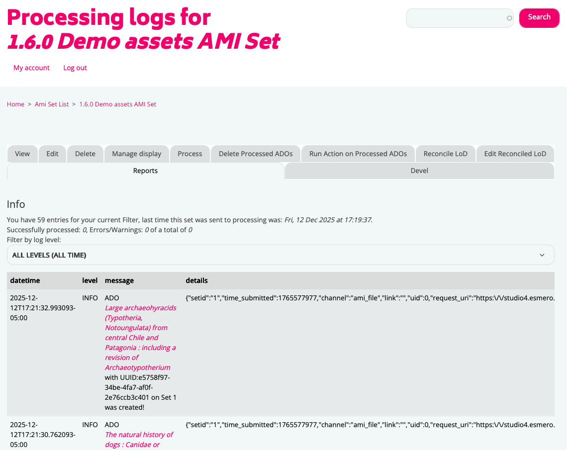 To review your newly created Digital Objects and Collections, you can use the AMI Set Report tab to ensure that your AMI Set ingested correctly.