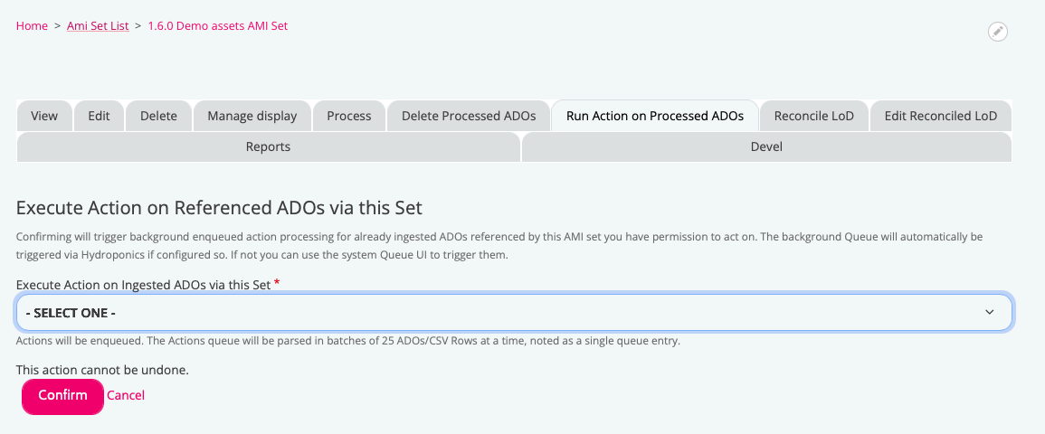 Lastly, you may wish to run a batch Action against your already-processed ADOs for a particular AMI Set. Using the 'Run Action on Processed ADOs' tab for an AMI Set, you can select from the available Actions found in your Archipelago instance. The most common Actions you might wish to run for an AMI Set's ADOs include 'Publish' or 'Unpublish', and 'Trigger Strawberrry Runners process/reprocess for Archipelago Digital Objects content item' (read more about Archipelago's Strawberry Runners Post-Processing Options here).