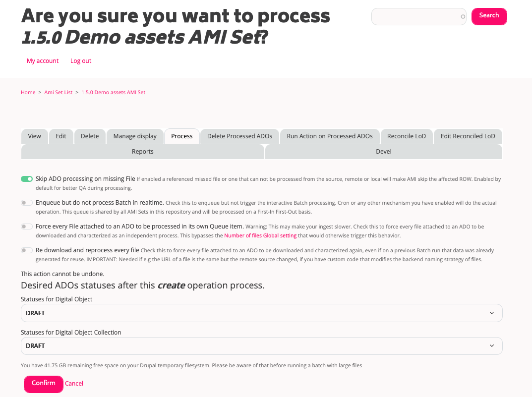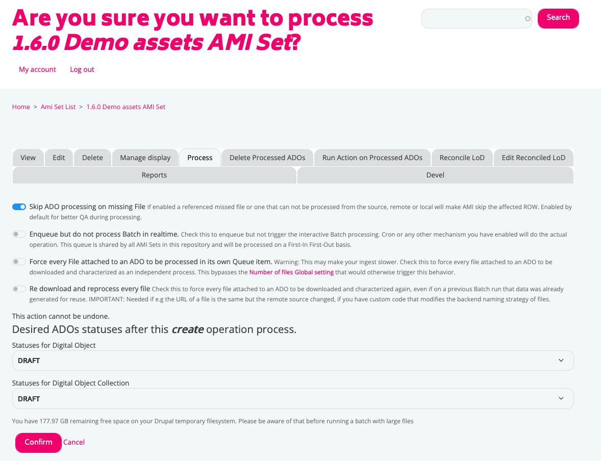 If you chose to 'Confirm' and Process your AMI Set immediately, proceed to Step 9: Processing and ADO Creation.