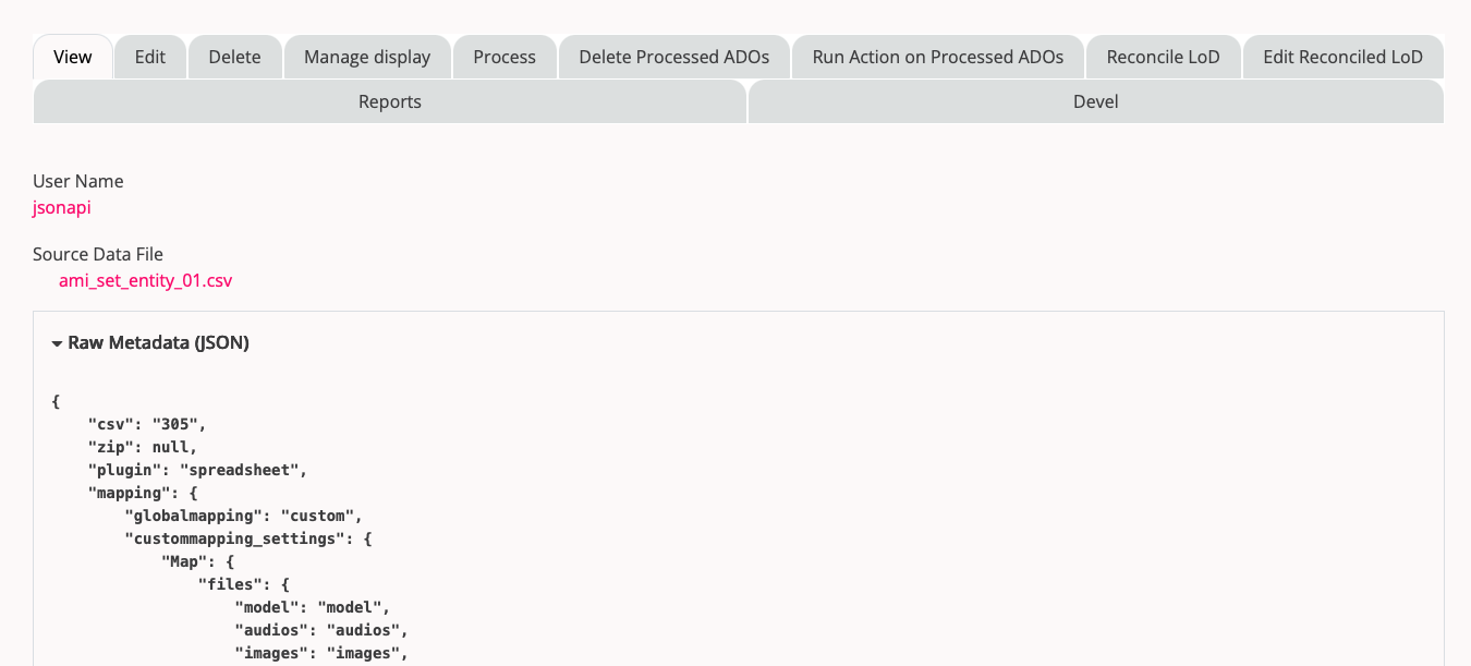 - Columns from your spreadsheet source will be cast to ADO metadata (JSON) using a Twig template setup for JSON output.
