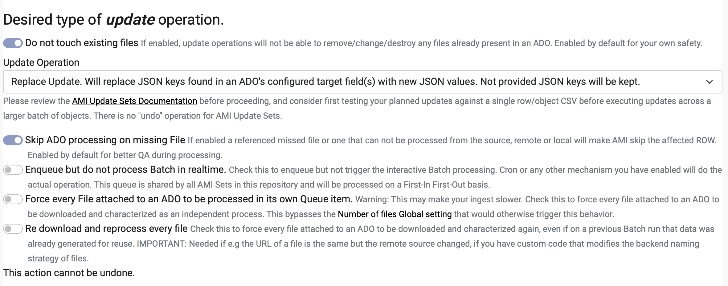 - on the final 'Process' tab of your AMI Update Set Configuration, if the "Do not touch existing files" option is checked, then existing files will be left untouched. It is recommended to always keep this option checked if you are targeting only Metadata updates.
