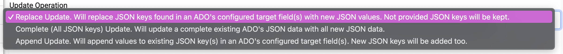 The Replace Update Operation Replace 'will replace JSON keys found in an ADO's configured target field(s) with new JSON values. Not provided JSON keys will be kept.'