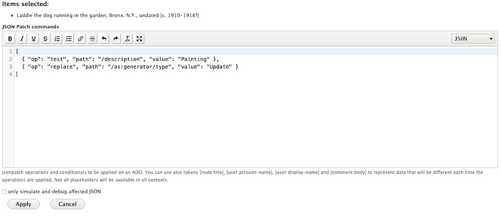 Once you have filtered down the list to manageable size, containing at least the ADOs you plan on modifying (but for JSON Patch operation could be more too because you can “test“ and match ), press either on Select / deselect all results in this view to pass all the result (this includes all pages, not only the currently visible one) or go selectively one by one by checking on the toggle found beside each ADO's title. You will see how the number in Selected 0 item in this view increases. Now press Apply to select Items. We will use for this example Laddie the dog running in the garden, Bronx, N.Y., undated [c. 1910-1918?], an ADO we provide in our DEMO sets.
