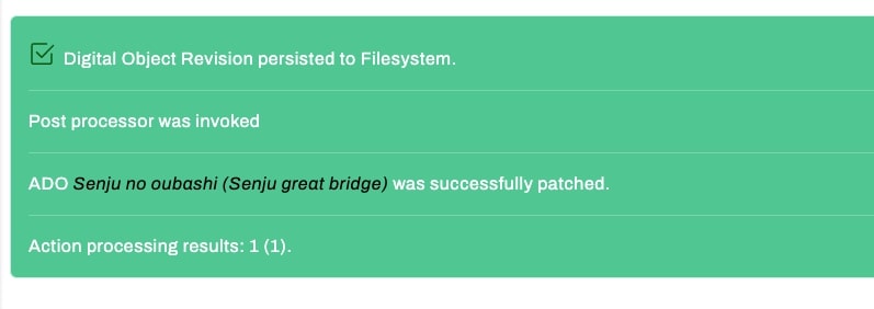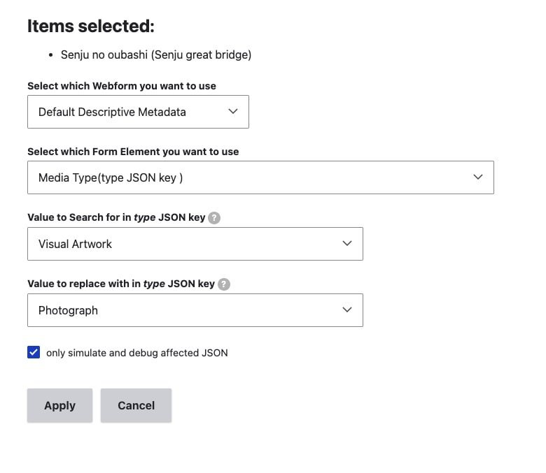 In the following example configuration, for the selected 'Senju no oubashi (Senju great bridge)' object, the Media Type (type JSON key) value of "Visual Artwork" will be replaced with the type JSON key value of "Photograph".