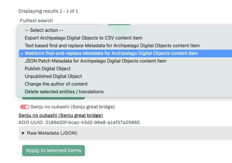 Webform find-and-replace Metadata for Archipelago Digital Objects content itemfrom theActiondropdown. - If selecting objects individually, expand the