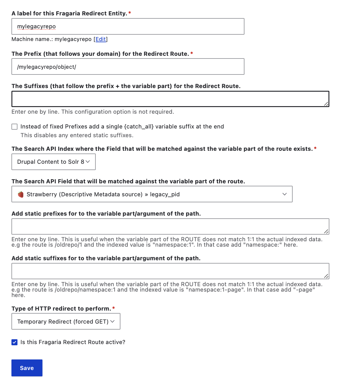 Is this Fragaria Redirect Route active?to set your Redirect toactive, and Save your configuration.