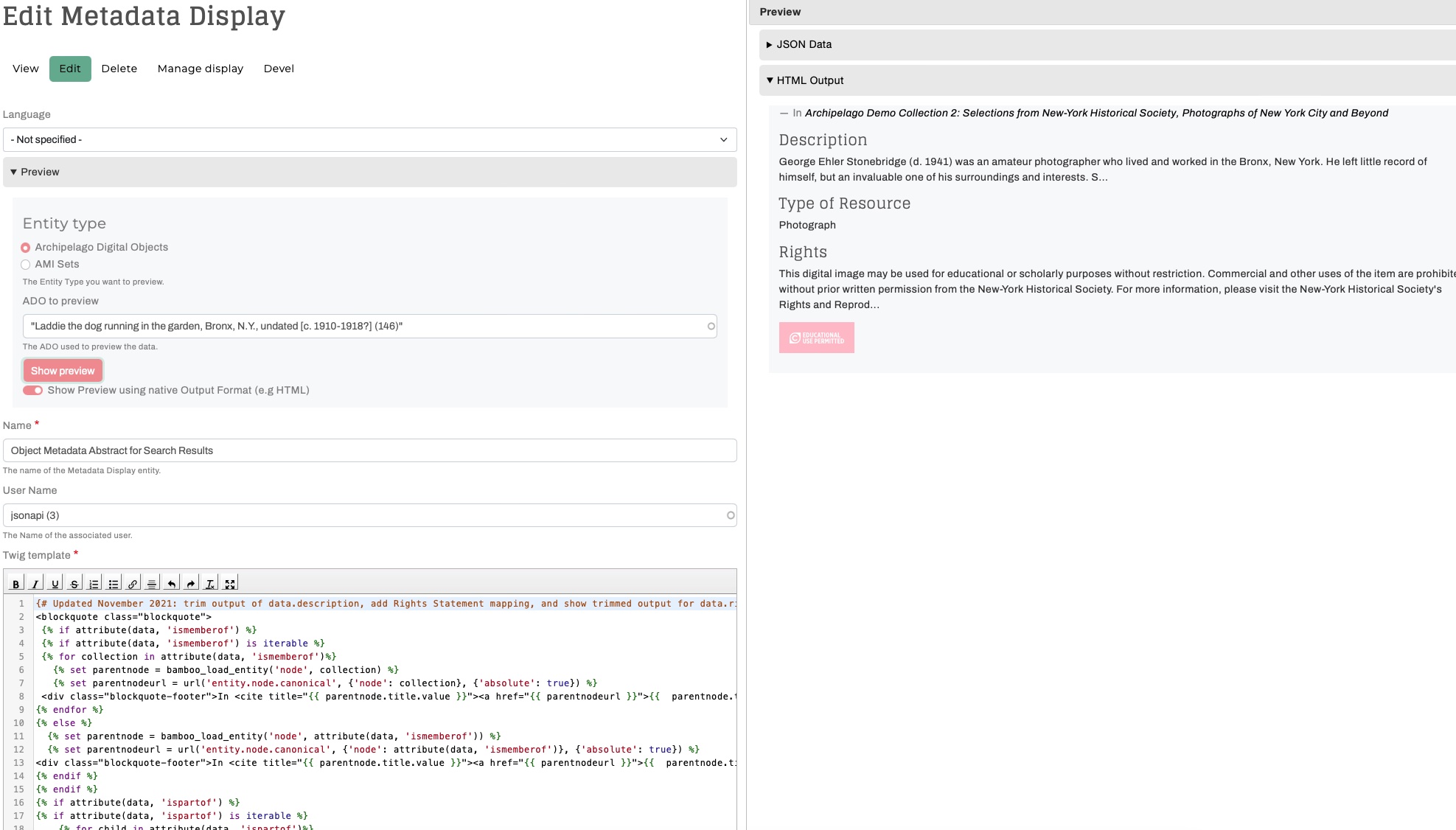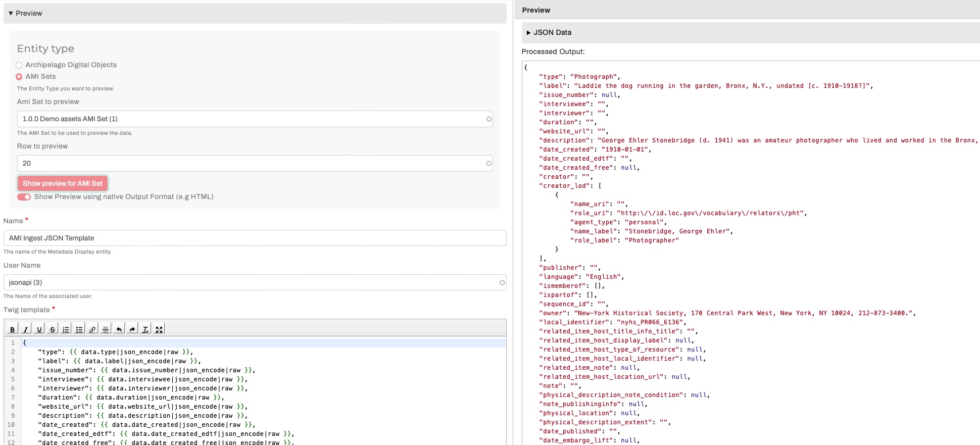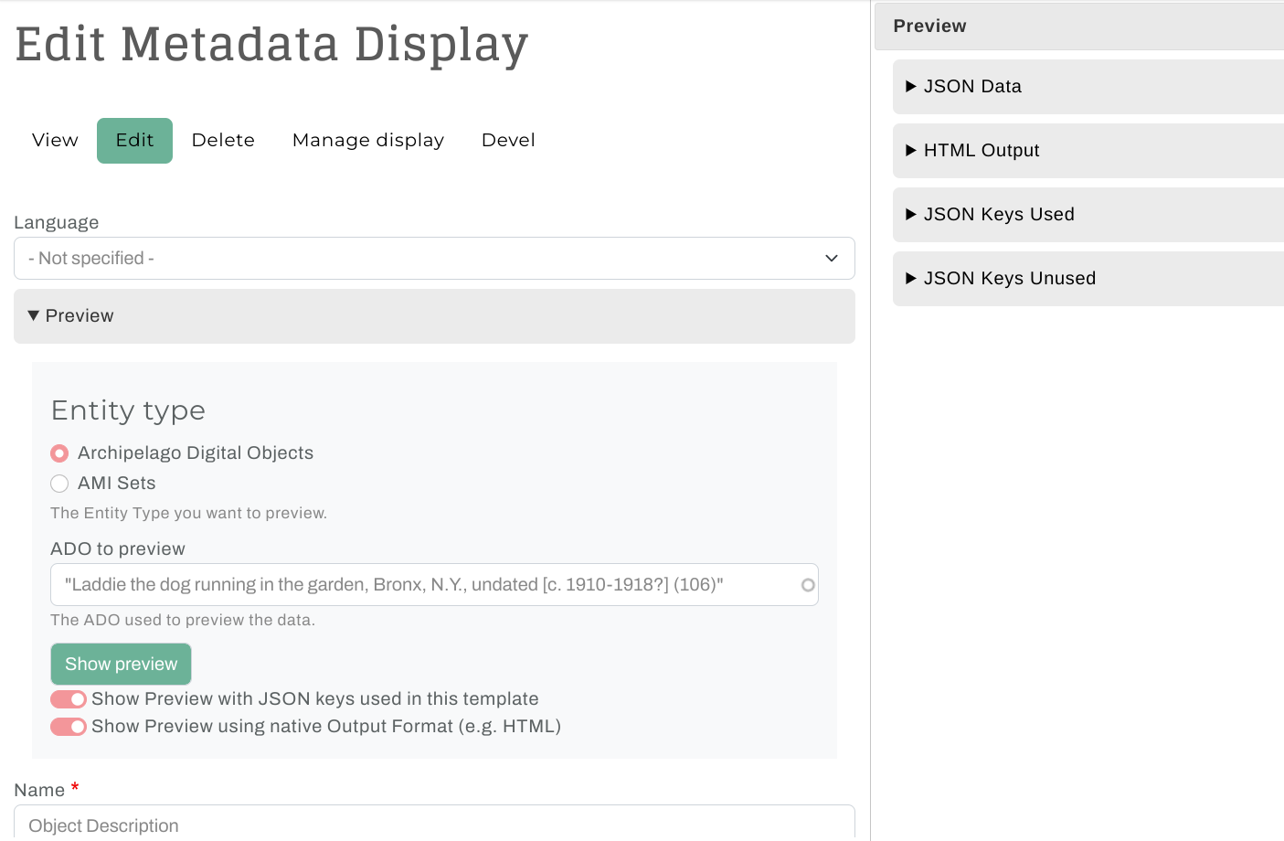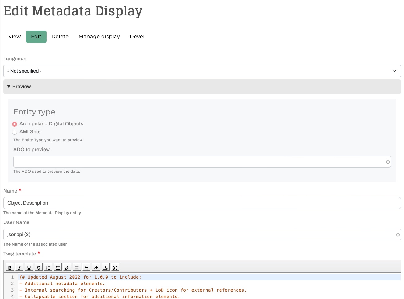 Archipelago's Metadata Display Preview is a very handy tool for your repository toolkit that enables you to preview the output of your Metadata Display (Twig) Templates (found at /metadatadisplay/list). You can use the Metadata Display Preview to test and check the results of any type of Template (HTML Display, JSON Ingest, IIIF JSON, XML, etc.) against both Archipelago Digital Objects (ADOs) and AMI Sets (rows within).