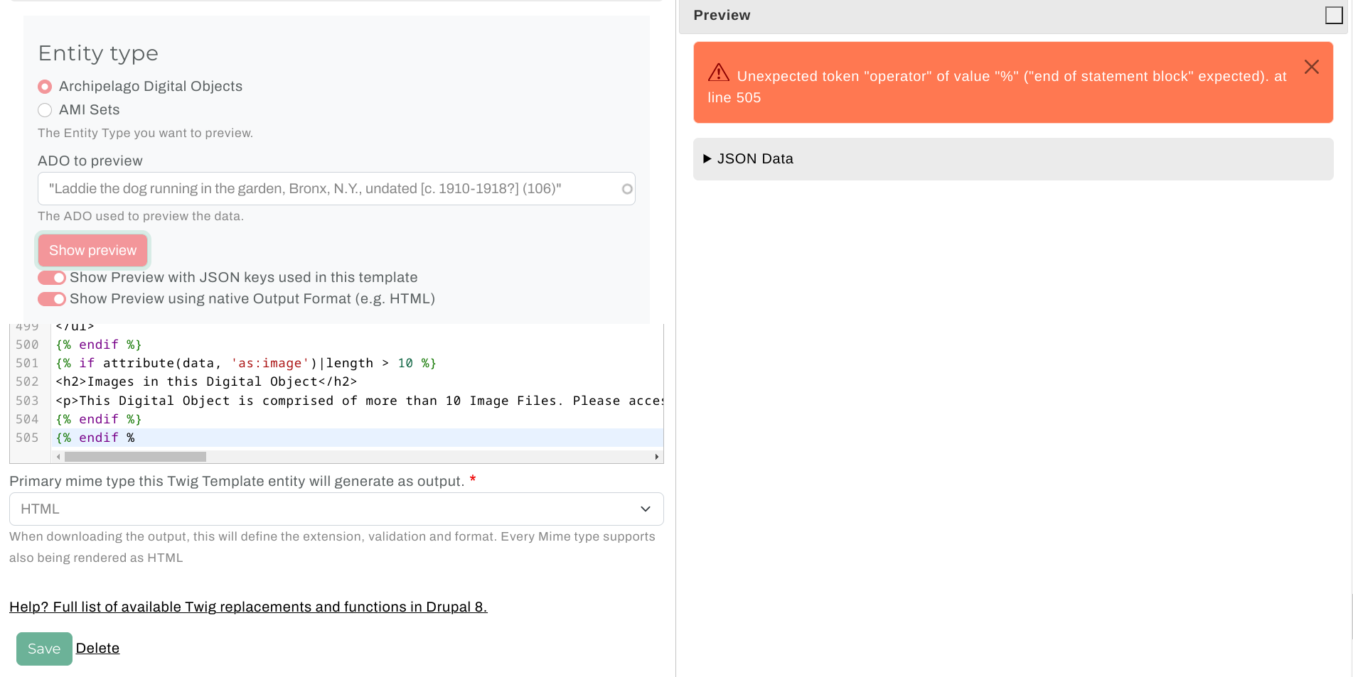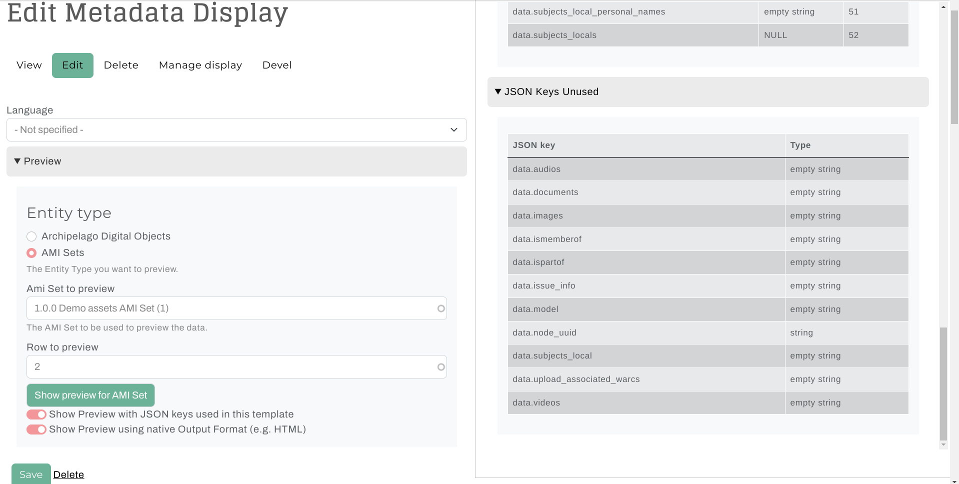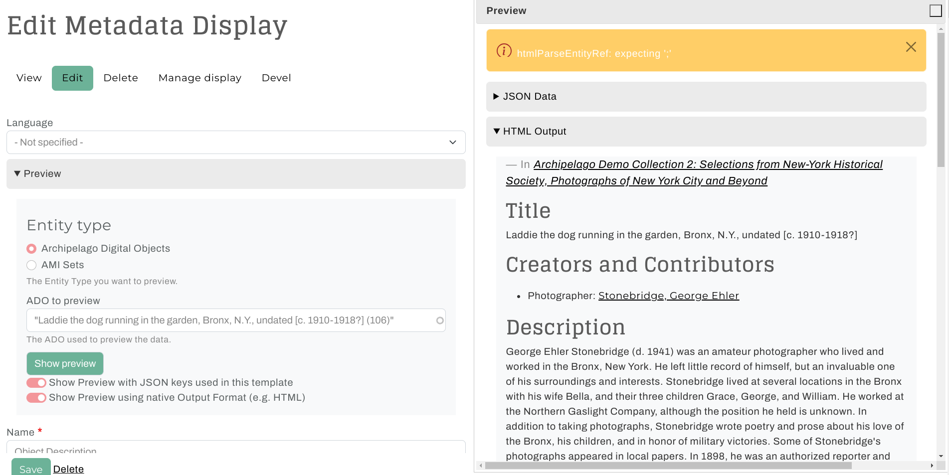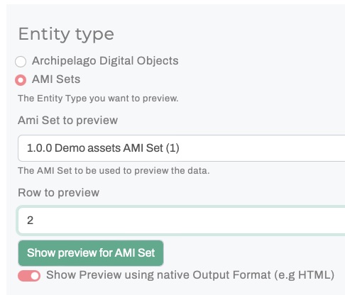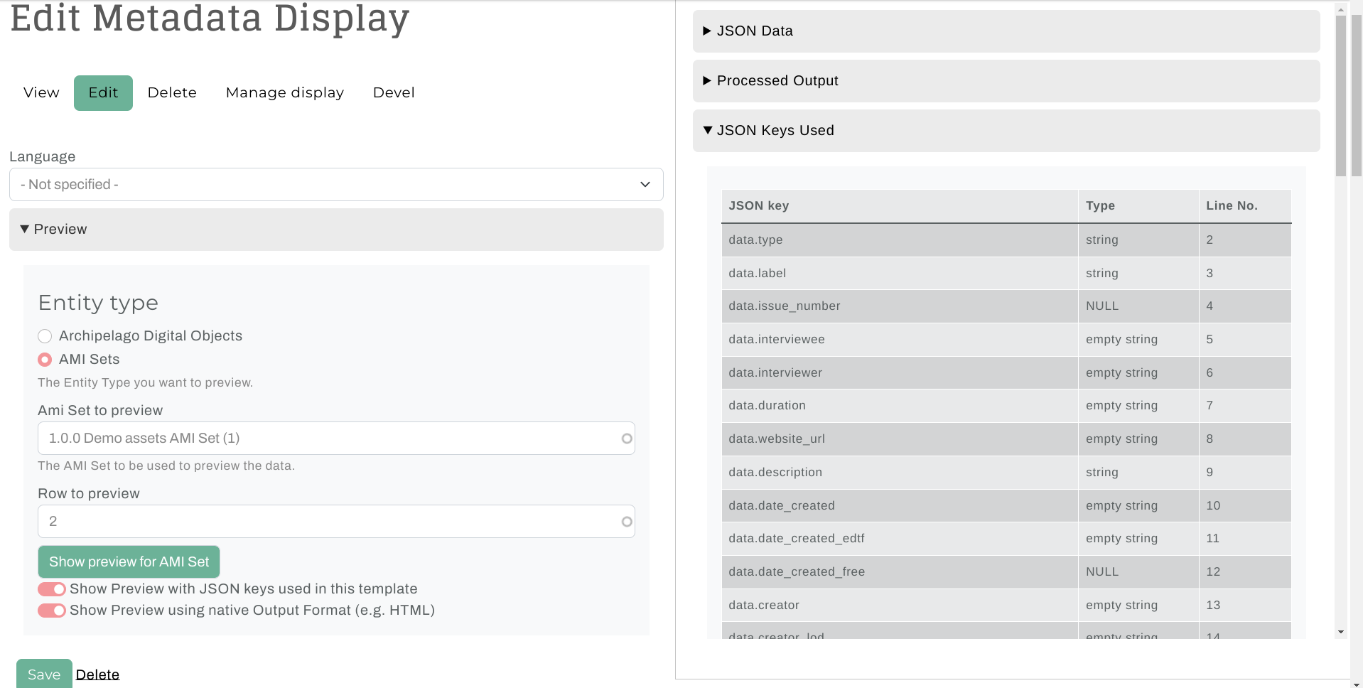 Archipelago's Metadata Display Preview is a very handy tool for your repository toolkit that enables you to preview the output of your Metadata Display (Twig) Templates (found at /metadatadisplay/list). You can use the Metadata Display Preview to test and check the results of any type of Template (HTML Display, JSON Ingest, IIIF JSON, XML, etc.) against both Archipelago Digital Objects (ADOs) and AMI Sets (rows within).