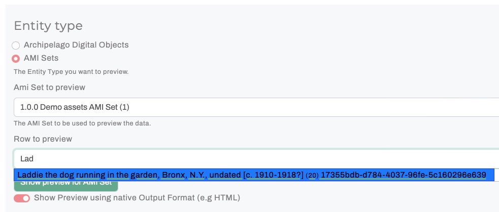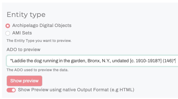 You will now be able to select either an Archipelago Digital Object (ADO) or AMI Set to Preview. Both selection types will use an autocomplete search (make sure the autocomplete matches fully against your selection before proceeding).