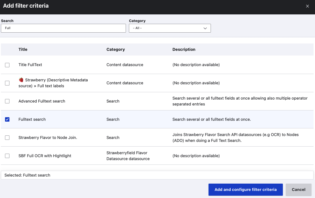 - Searched fields : leave all unselected, so "If no fields are selected, all available fulltext fields will be searched."