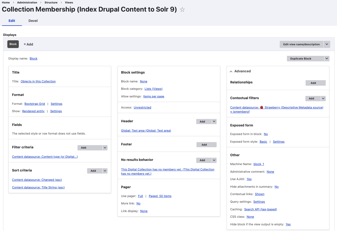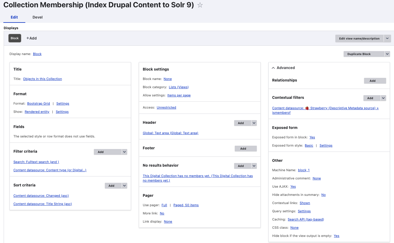 This View is setup to list the member Digital Objects of a Collection and is driven by Solr.