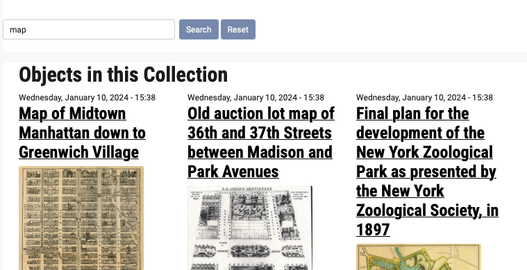 In this screenshot, you can see a demonstrative Search for 'map' within one of the Archipelago Demo Collections.