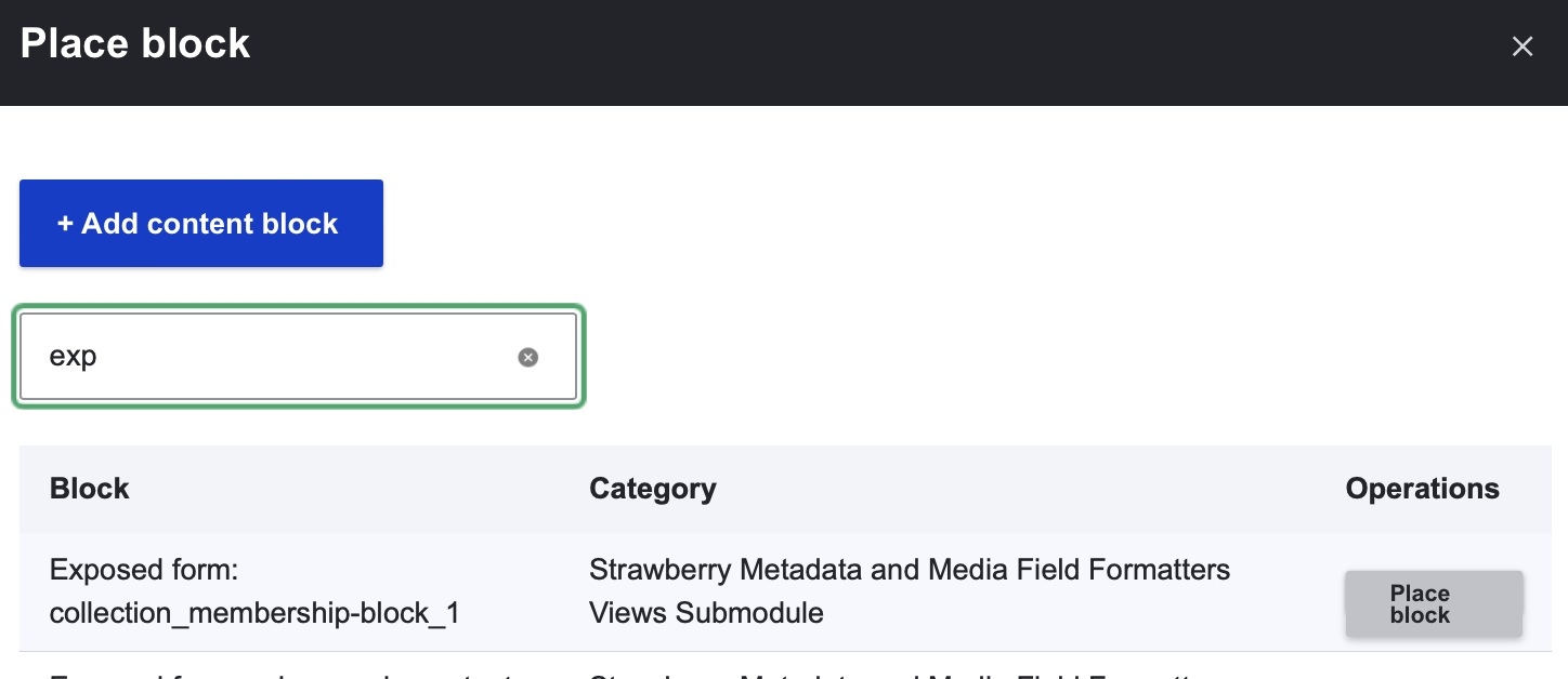 Search for the 'Exposed form: collection_membership-block_1' and select 'Place Block'.