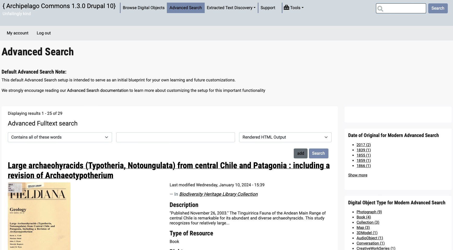 The default Advanced Search setup shipped with standard Archipelago deployments is intended to serve as an initial blueprint for your own learning and further customizations. Your Archipelago instance, whether you are working in a modified local or production deployment, may not have the same corresponding Solr Fields and/or Facets as present in the default Advanced Search configuration. This guide covers the default Advanced Search Setup, and offers general guidance for customizing to match your desired Advanced Search setup for your unique environment variables (metadata elements/schema found in your JSON data, Keyname combinations, Solr fields, etc.).