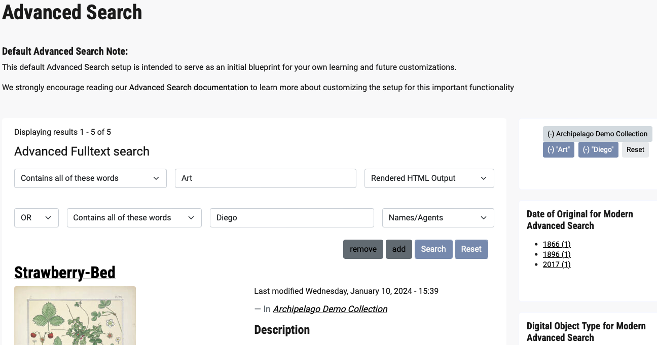 In your local or fresh live Archipelago deployment, populated with the Archipelago Demo Set Objects and Collections, test your Advanced Search setup using the following query: - 'Contains all of these words' + the term 'Art' in the 'Rendered HTML Output' Field - 'OR' operator + 'Contains all of these words' + the term 'Diego' in the 'Names/Agents' field - Select the 'Archipelago Demo Collection' from the Collection Membership Facet