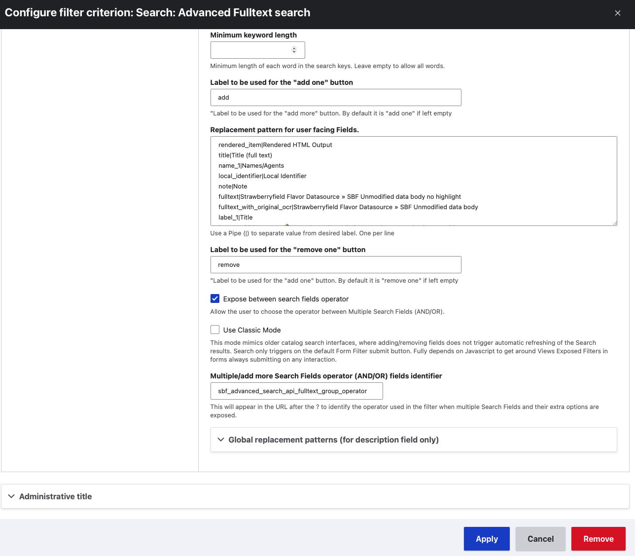 To provide Advanced Search functionality, Archipelago extends a custom Search API based Fulltext Filter for (Drupal) Views. This special 'Search: Advanced Fulltext search' filter is capable of handling multiple inputs with a combination of Boolean Operators, and features additional customizable options for tailoring your Archipelago's Advanced Search setup.