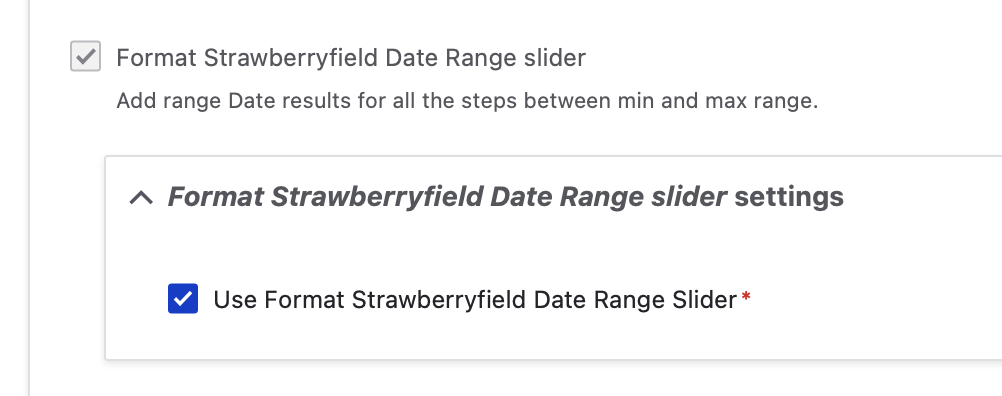Format Strawberryfield Date Range slideris checked and non-changeable, and a separate subsection with the corresponding checked option toUse Format Strawberryfield Date Range Slider.