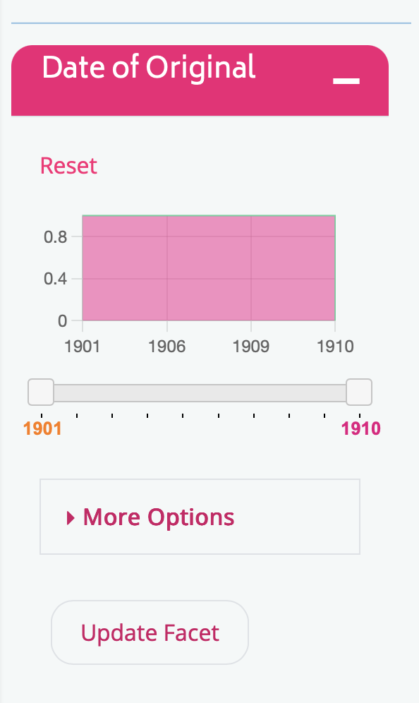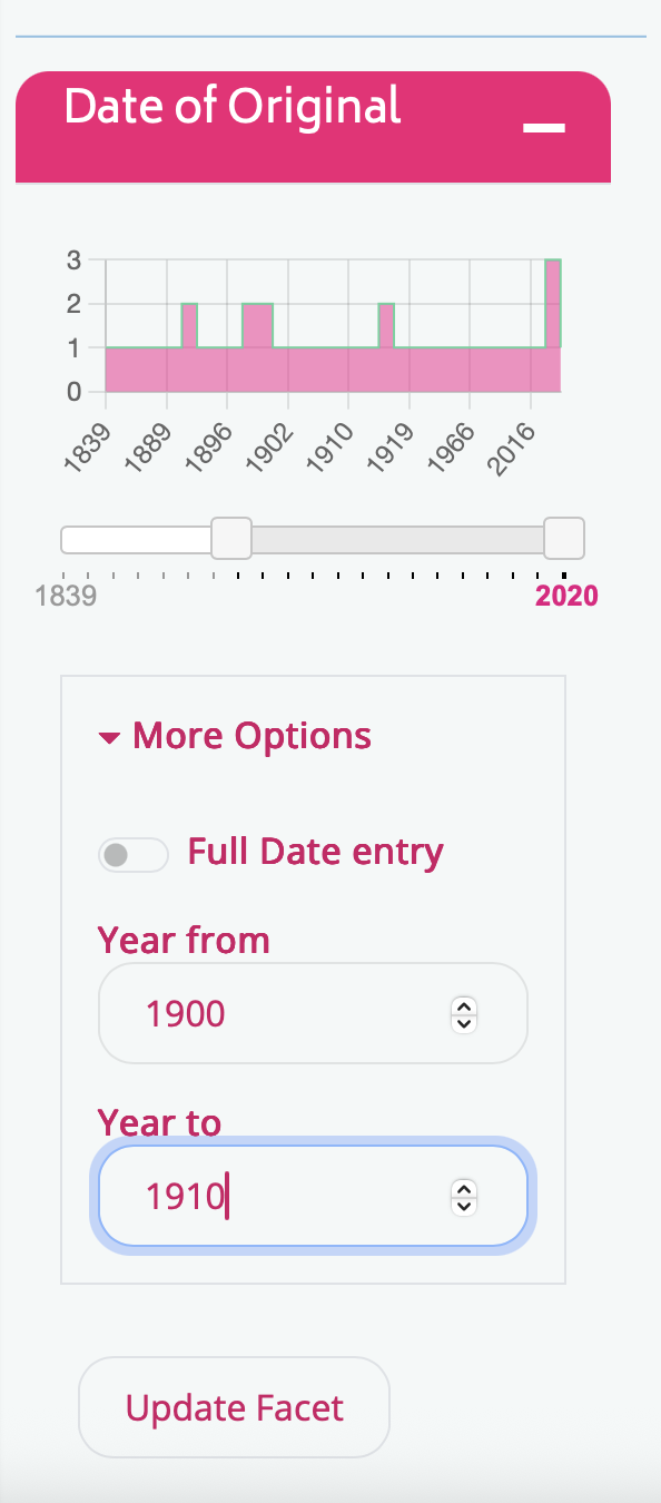 - Part 1 - Under 'More Options', a user inputs a date span of 1900 to 1910. The date range slider shifts to the initial 'Year from' date entered when the user moves to the 'Year to' box, but the overal histogram graph and end range do not yet update. This shift gives the user a visual cue that the Facet is responding to their query, but the fuller settings are not yet applied until the user selects the 'Update Facet' button.