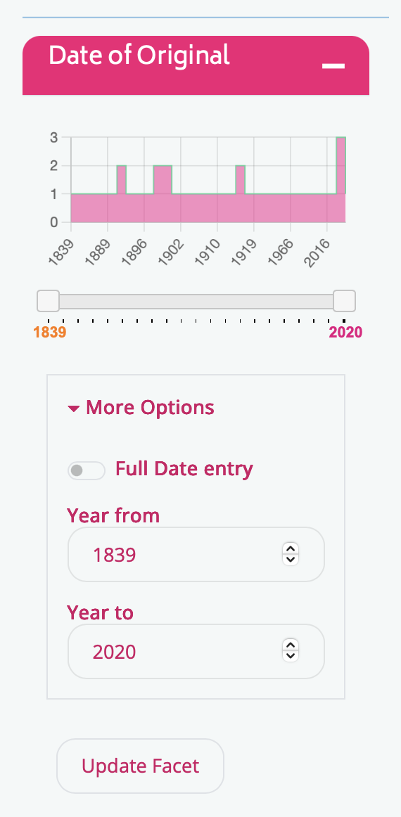 - Part 2 - After the user selects the 'Update Facet' button, the full Year From and Year To date range is applied to the executed query. For the 'Date of Original' facet display, the date range histogram is updated to reflect the queried date ranges.