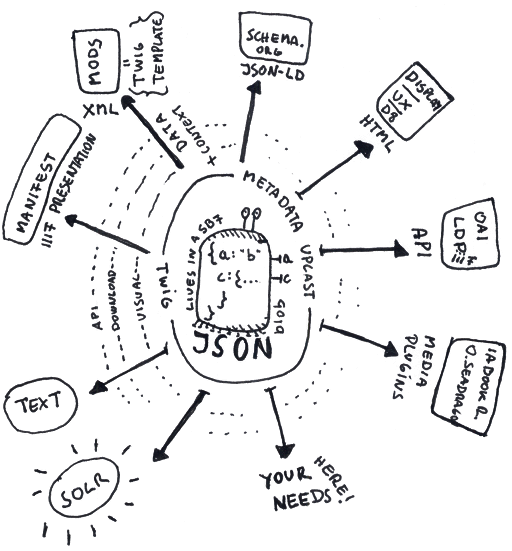 By design (and because we think its imperative), Archipelago takes full charge of the metadata layer and associated media assets by implementing a highly configurable, smart Drupal field written in JSON named Strawberryfield that attaches to any content.