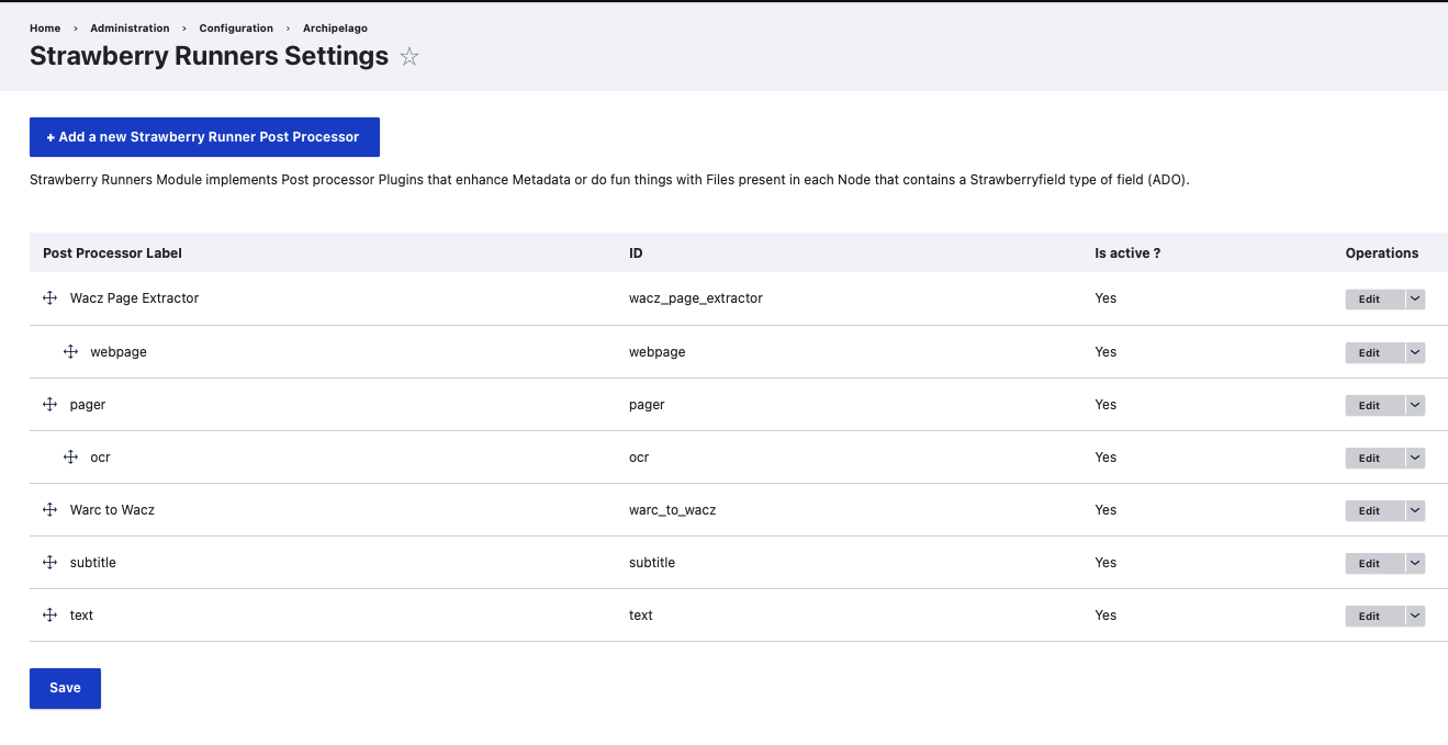 On the Strawberry Runners Settings page, you will see the Archipelago default post processor configurations (unless modified).