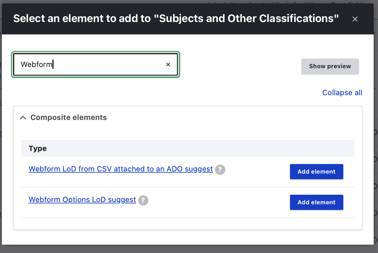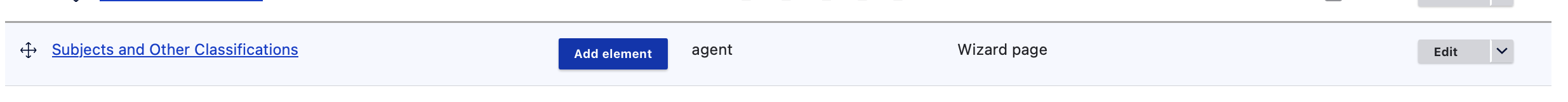 Scroll down to the 'Subjects and Other Classifications' page of the Webform and select 'Add Element'.