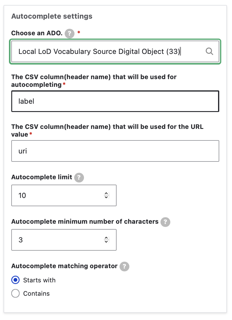 - In the 'Choose an ADO' box, begin typing to search for the Digital Object that holds a CSV containing the Vocabulary you want to autocomplete.