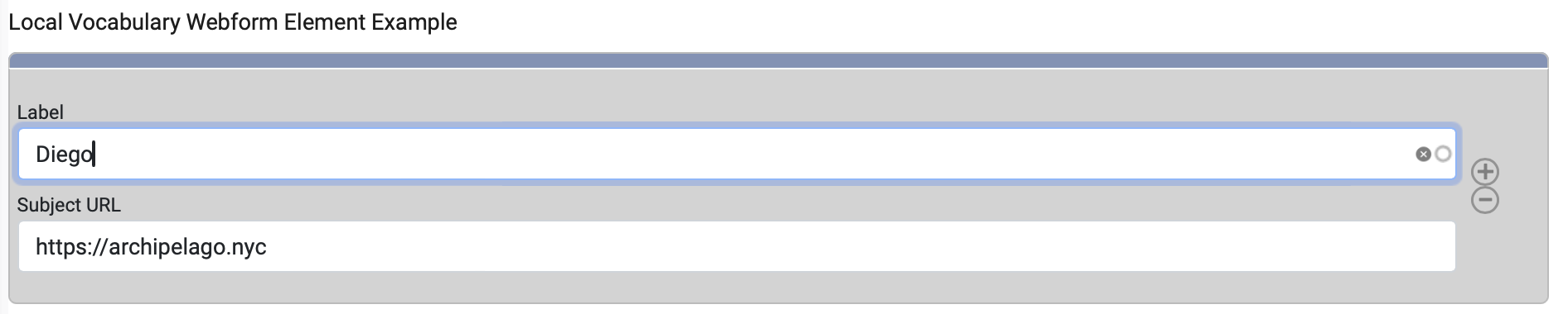 Archipelago's custom webform element 'Webform LoD from CSV attached to an ADO suggest' provides a form element autocomplete labels/urls(values) from a CSV attached to a Digital Object. Using this element affords a way for you to utilize a custom local vocabulary, a subset of labels and URIs from a wider LoD authority source, or an LoD vocabulary that does not have an accessible API or public query service.