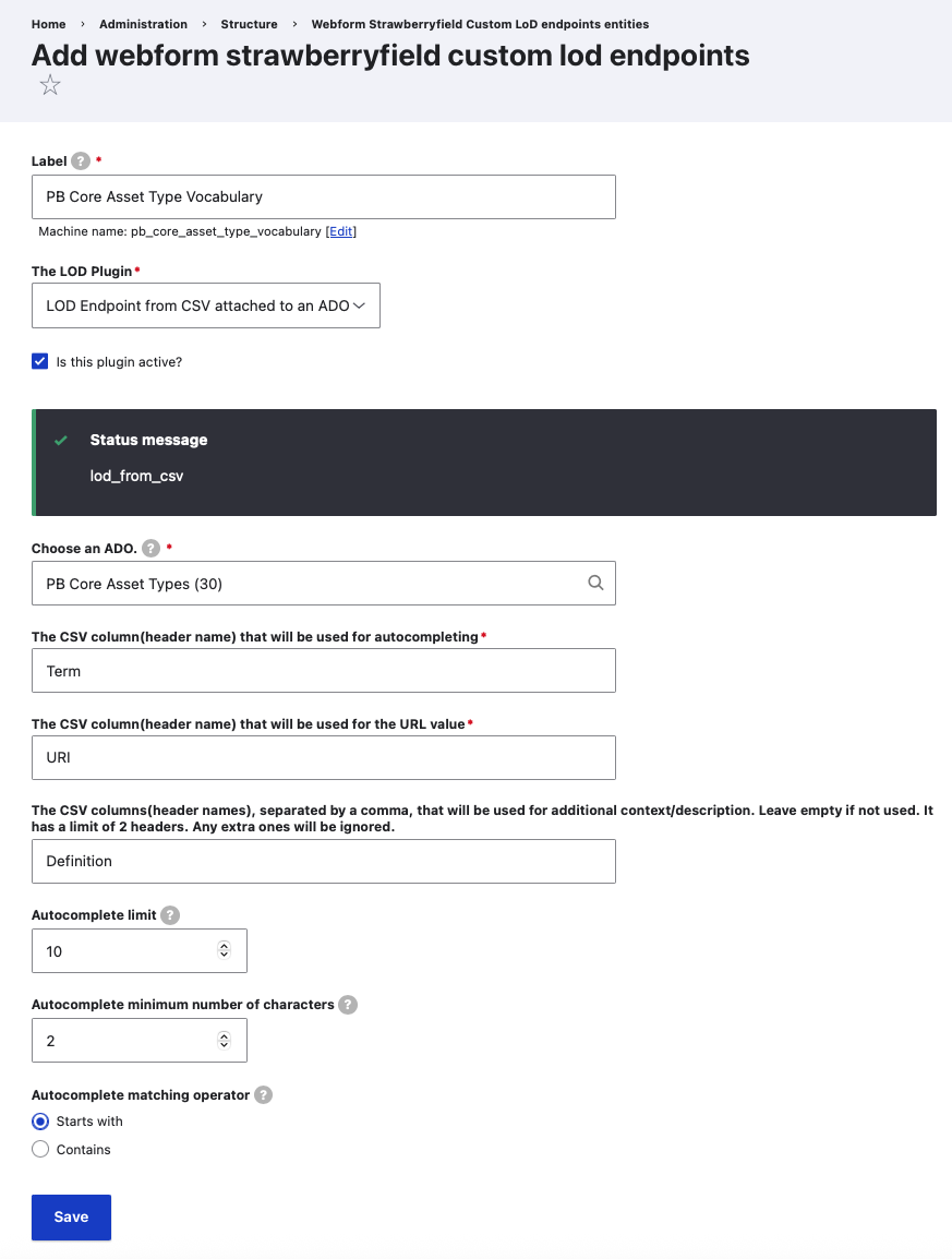 Webform Strawberryfield Custom LoD endpoints entities page and selectAdd Custom LoD endpoint. Fill in the form as shown in the following screenshot, except reference the custom ADO you created in Step 1 under 'Choose an ADO' and be sure to use the column headings found in your custom ADO's associated CSV file. Be sure to Save your configuration form when you are ready.