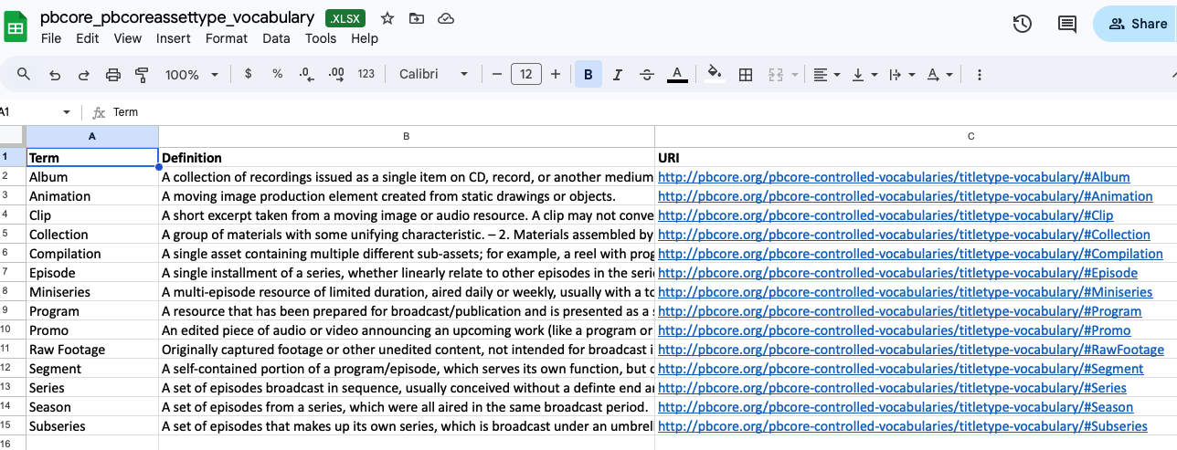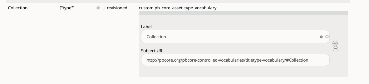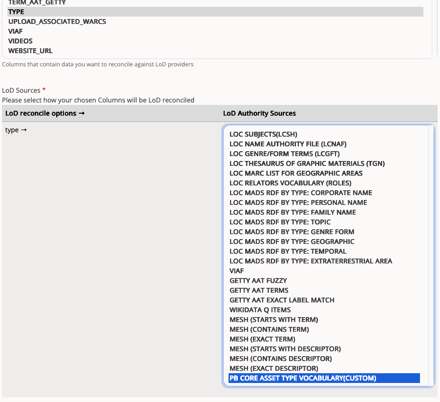 - First, create a custom ADO using the steps outlined in Archipelago's 'Webform LoD from CSV attached to an ADO suggest' documentation guide. For the example screenshots shown below, the 'PB Core Asset Type' vocabulary was used.