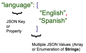 - For "language": ["English","Spanish"]- "language" = JSON Key or Property - "["English","Spanish"]" = Multiple JSON Values (Array of Enumeration of Strings) -