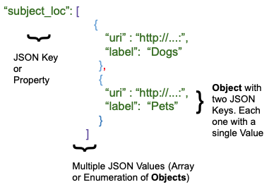 "subject_loc":[{"uri":"http://..","label":"Dogs"},{"uri":"http://..","label":"Pets"}]- "subject_loc" = JSON Key or Property