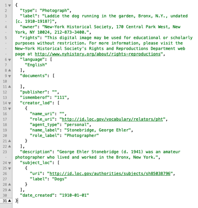 All examples shown below are using the following JSON snipped from Laddie the dog running in the garden, Bronx, N.Y., undated [c. 1910-1918?].
