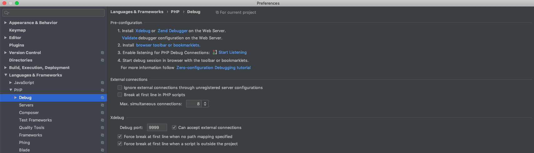 Preferences > Languages & Frameworks > PHP > DebugorSettings > PHP > Servers. In this window there is an Xdebug section. Use these settings:- Debug port:
