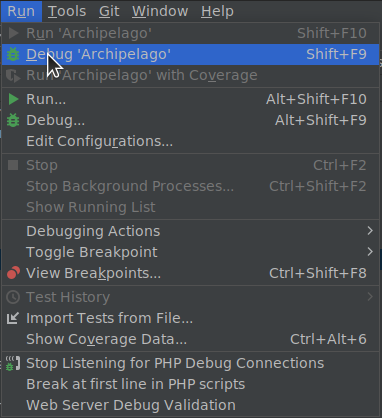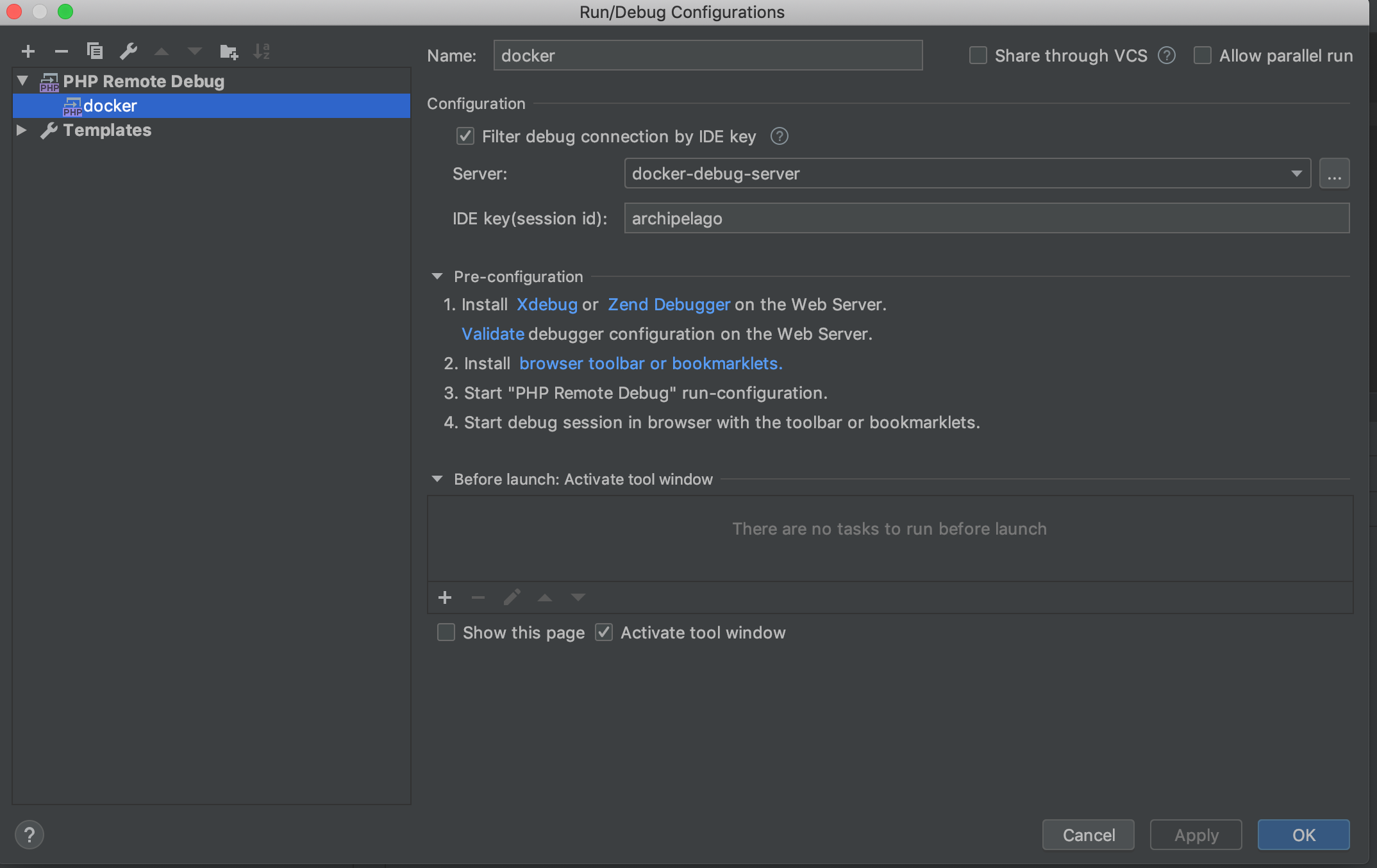 Run > Edit Configurations. Hit the+Button to create a new PHP Remote Debug. Name whatever you want, I called mineArchipelago. Use these settings:- Filter debug connection by IDE Key: yes, select the checkbox
