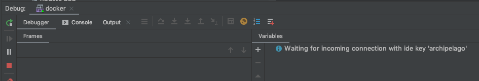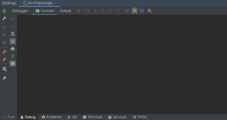 Run > Debugand select theArchipelagonamed configuration that we created in the previous steps. The debugging console will appear. It will say it is waiting for incoming connection from 'archipelago' . -